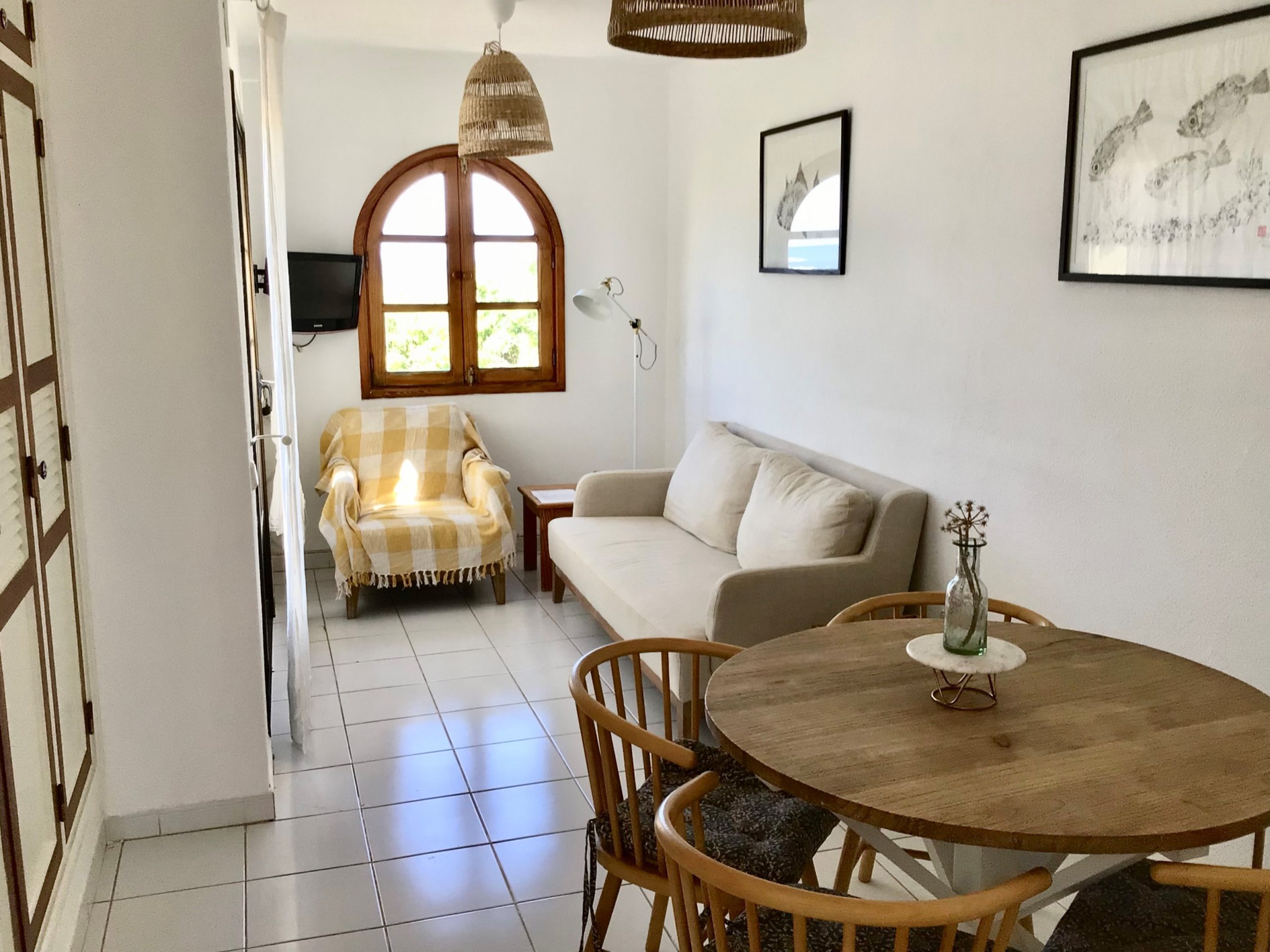 El apartamento está en la seguna planta y tiene 2 habitaciones dobles, baño con ducha. La cocina tiene microondas, horno, cocina de 4 fuegos, tostadora y tetera. El comedor y el salón tienen capacidad para 4 personas y cuentan con TV, wifi, muchos libros y DVD.
